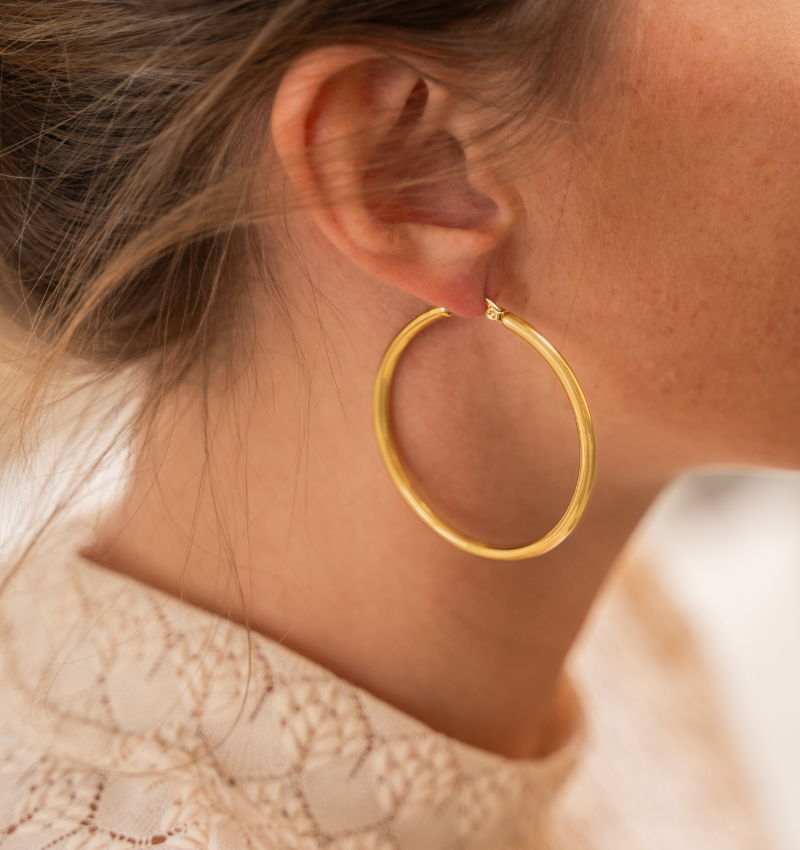 Statement alert! With these large gold hoops (7 cm), you give every outfit a hefty dose of power & style. Whether you wear them with a basic look or pair them with a festive outfit, these eye-catchers always complete your look.