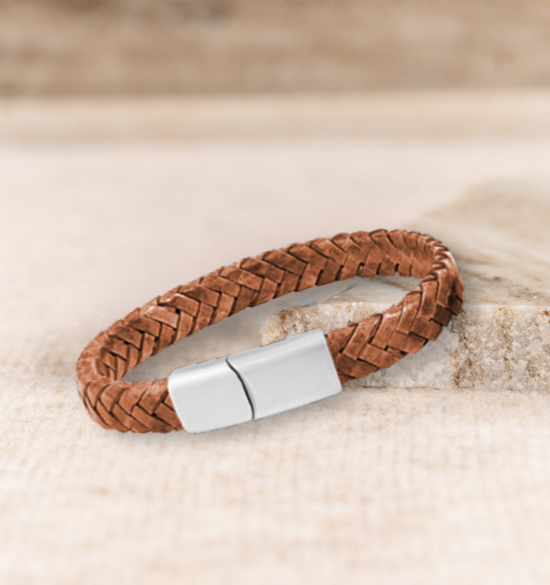 A sturdy bracelet made of braided brown leather, timeless, rugged, and full of character. The perfect gift for any boy.