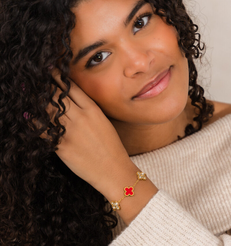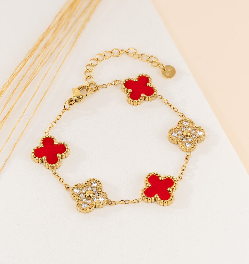 Bracelet Clover Red with Crystals | Stainless Steel - Zilver