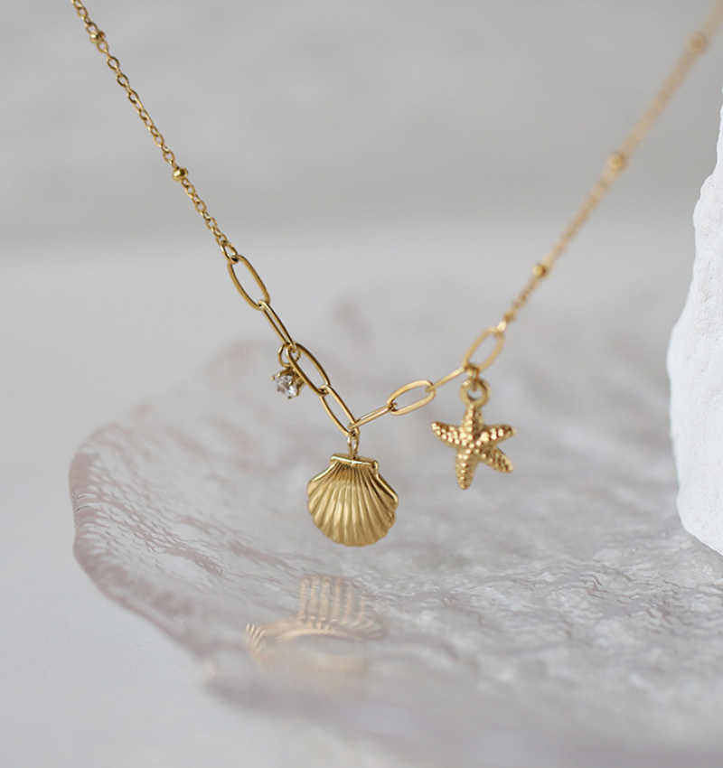 A cheerful necklace with a shell, for ladies who like to add a bit of sea and sun to their look.