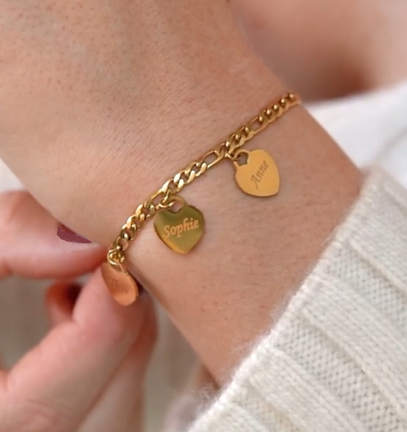 A personal touch: bracelet with two heart-shaped charms that can be engraved.