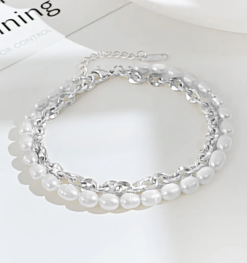 Double Bracelet with Links and Pearls | Stainless Steel - Silver