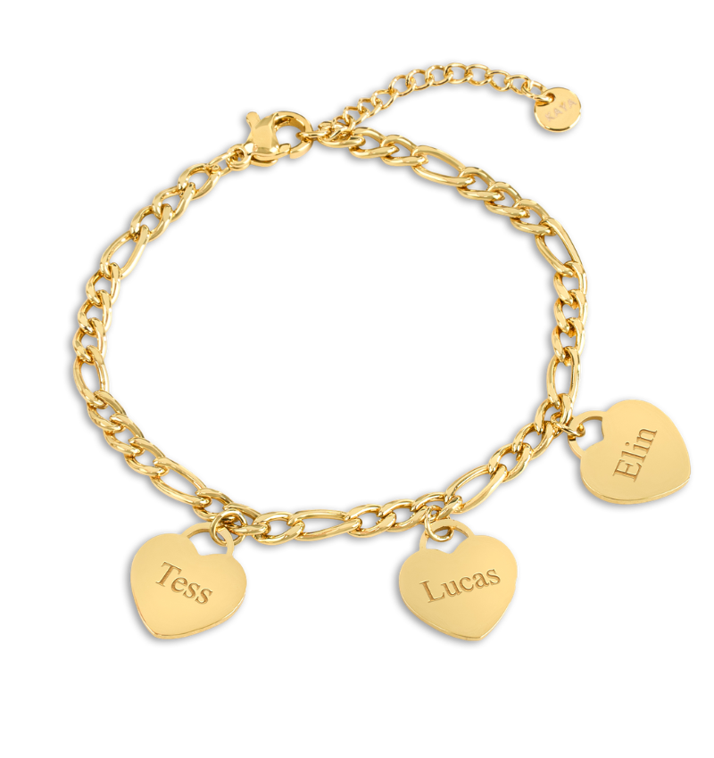 A personal touch: bracelet with three heart-shaped charms that can be engraved.