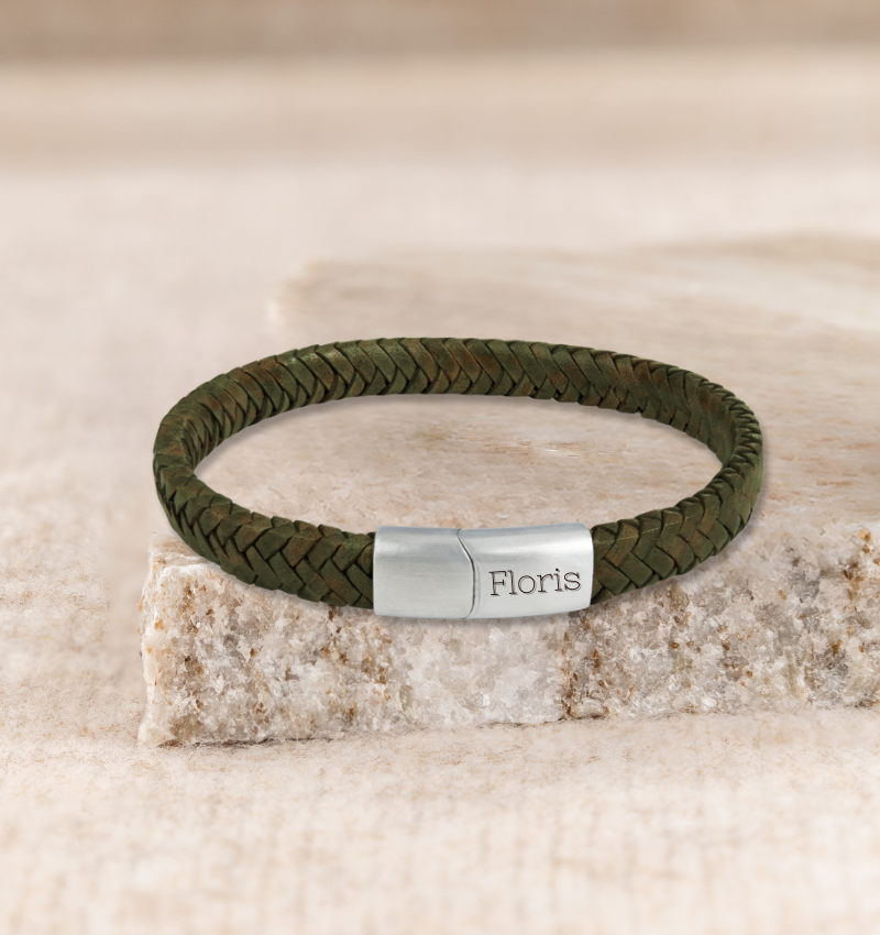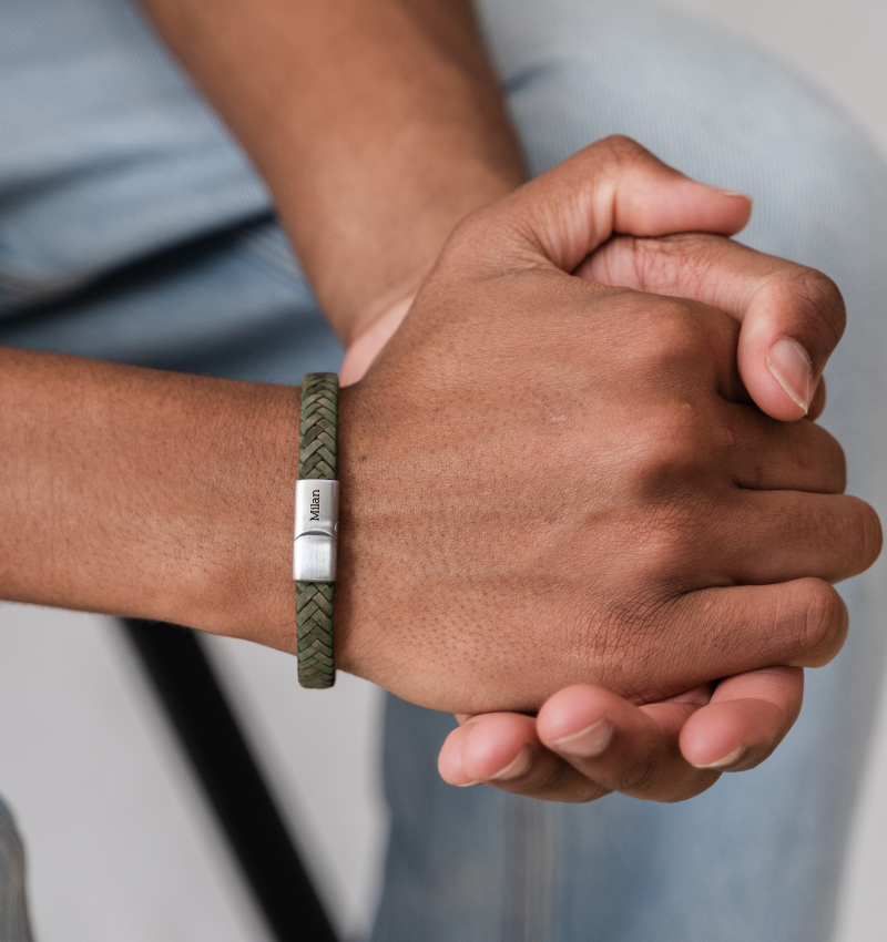 Boys' Braided Leather Bracelet with Engraving - Green