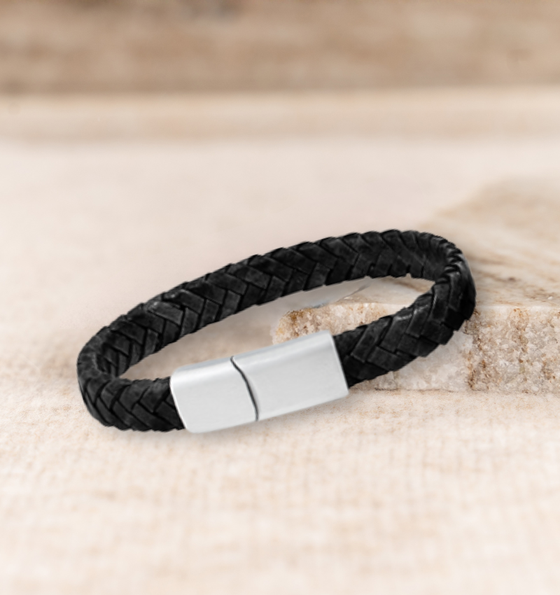 A robust leather bracelet that exudes character and style. Made of braided leather, perfect to give to your son, nephew, or a friend.