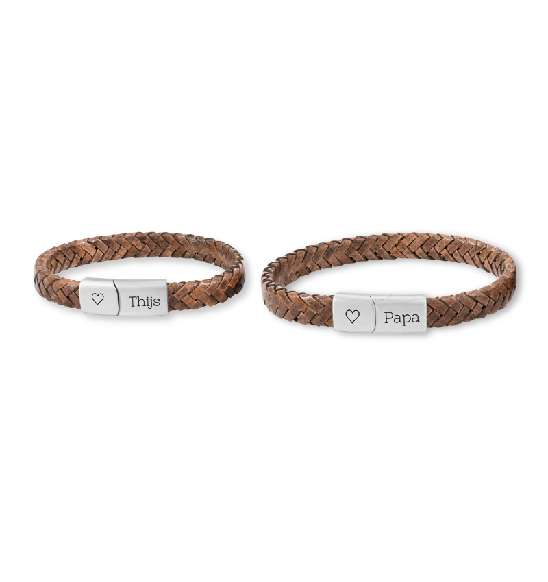 Two bracelets, one band. A robust set of carefully woven leather, with engravings as a powerful symbol of your bond.