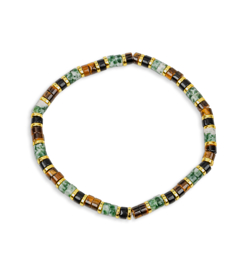 Featuring green gemstone beads and a touch of gold-tone stainless steel beads, this bracelet is perfect for any style.