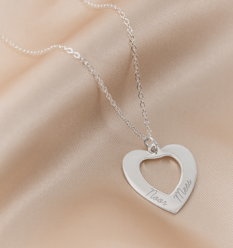 Brilliant chain with a graveerbedel thereto in the form of a cut-away heart. Both are engravable are, for example, 2 children's names, a name + a date, or something else. By-and-by .925 sterling silver and beautiful pearl in the middle, forever beautiful.