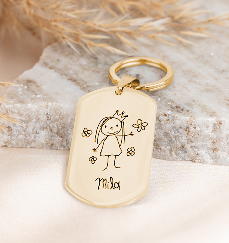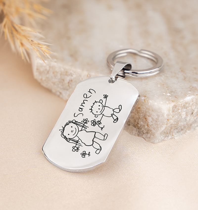 Have the most beautiful drawing of the little one captured on this key ring. This way you always carry the love of your child with you.