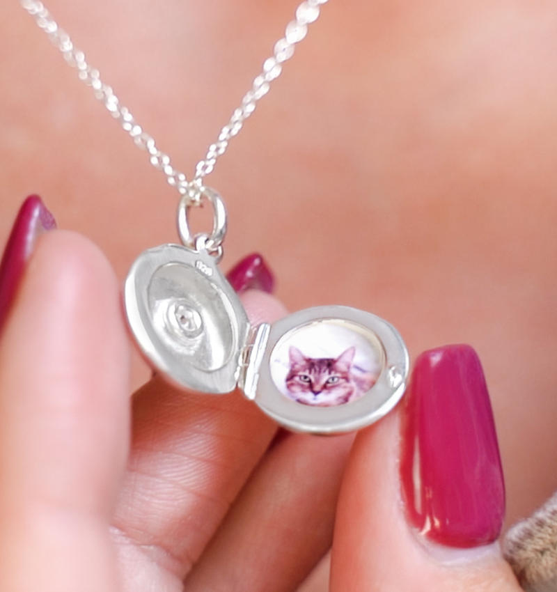 An elegant silver necklace with a medallion to place a precious photo. Also have a name or date engraved on the back. Always carry your loved ones close to you.
