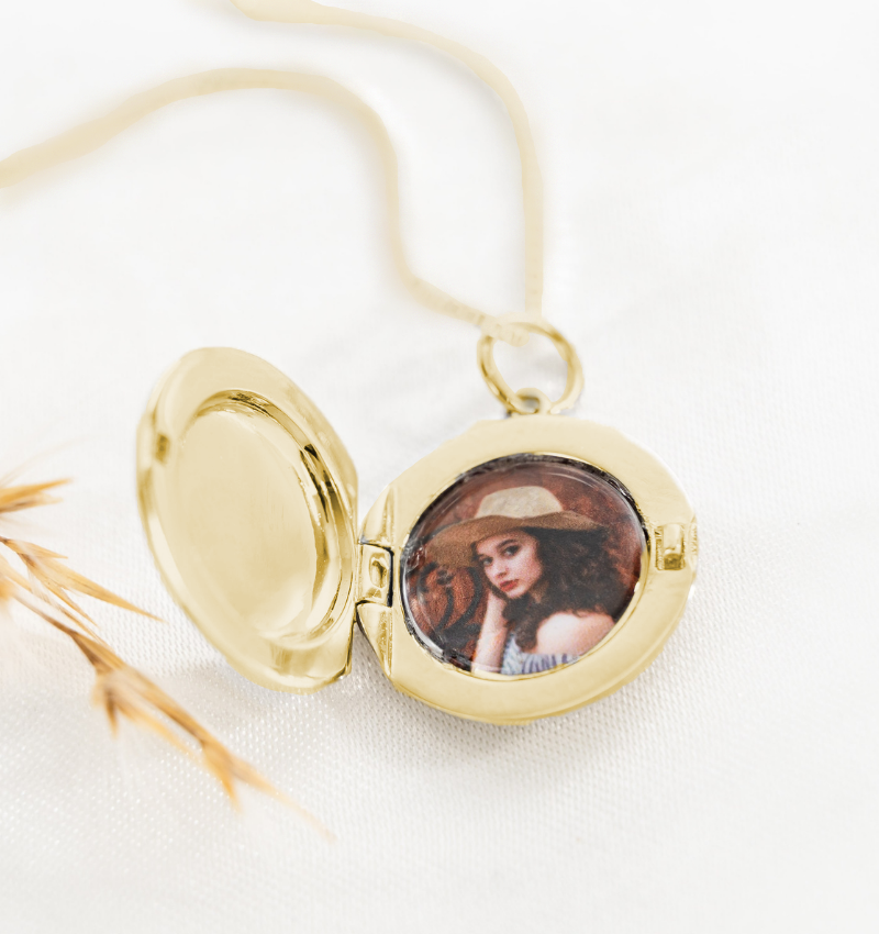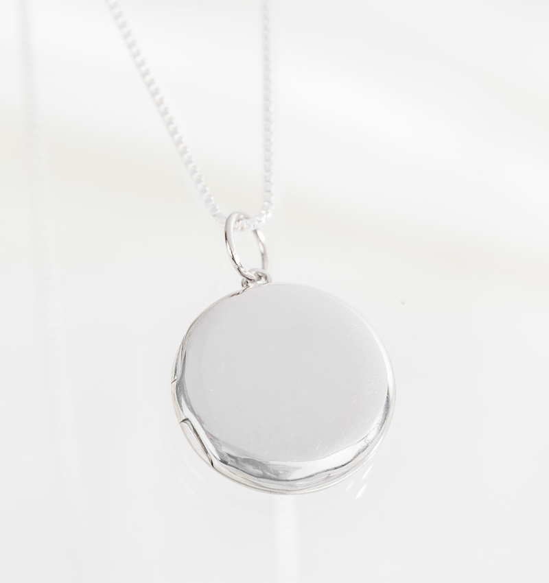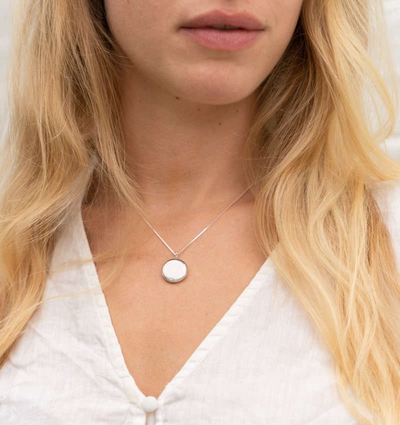 An elegant silver necklace with a medallion to place a precious photo. Also have a name or date engraved on the back. Always carry your loved ones close to you.