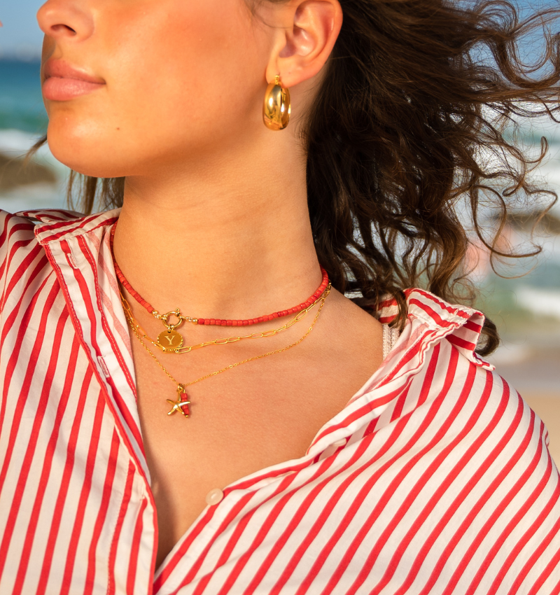 This fiery red necklace is as vibrant as the summer sun. The coral beads create a sultry, playful look and your chosen charm completes the ensemble.