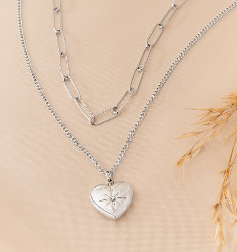 Chain necklace ‘Diamond Heart’ layered | Stainless Steel - Zilver