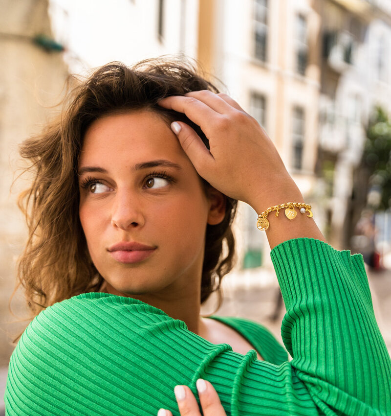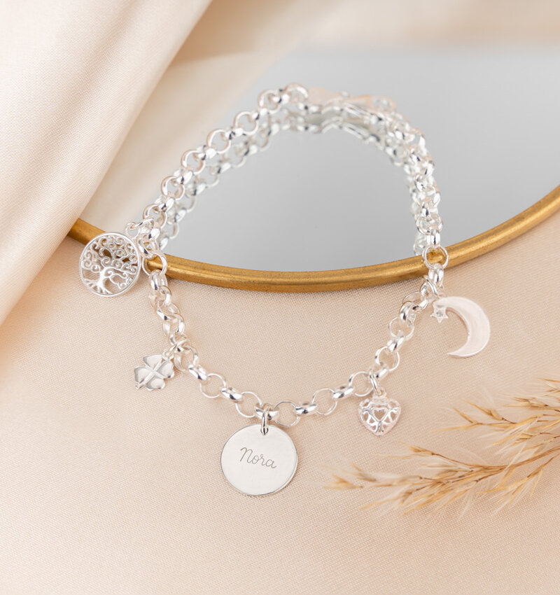 Jasseron charm bracelet that you can fully personalize. Choose a beautiful engraving, sweet charms, and birthstones and create your perfect bracelet!