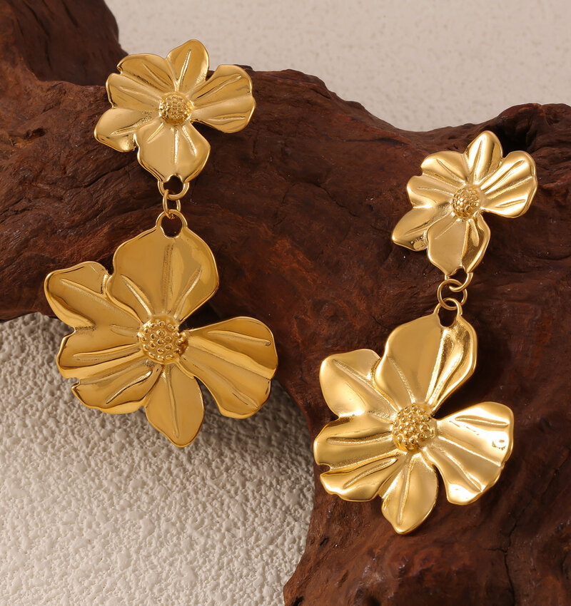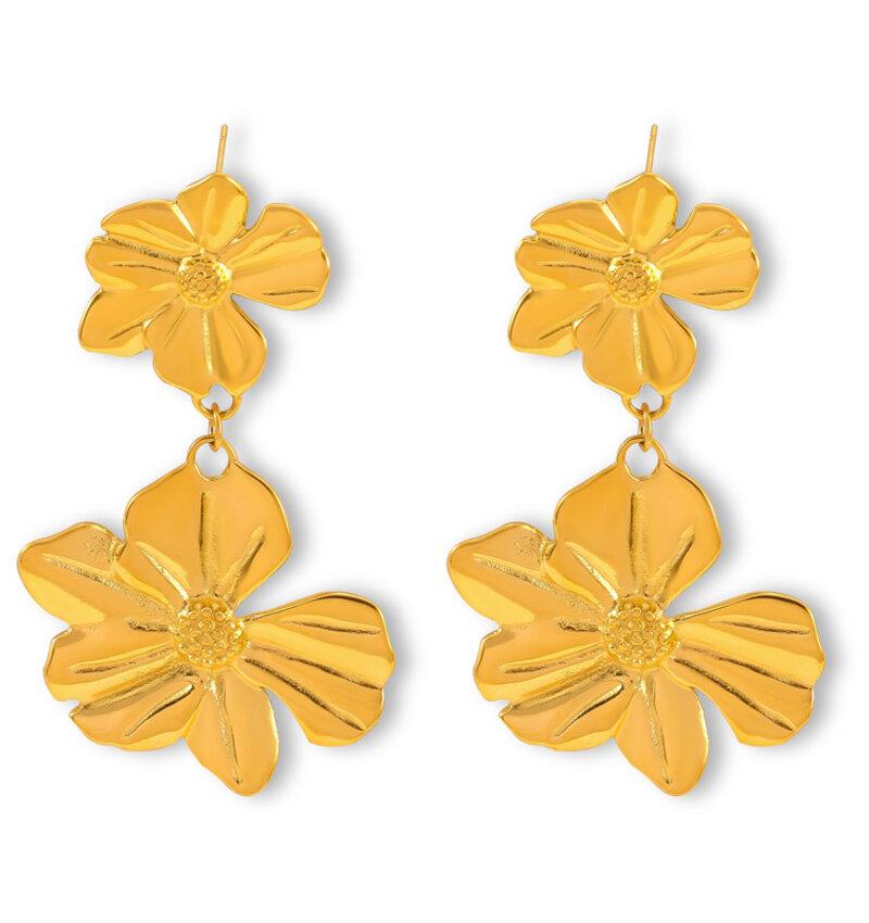 Statement drop earrings with 2 flowers | Stainless Steel Gold - Gold