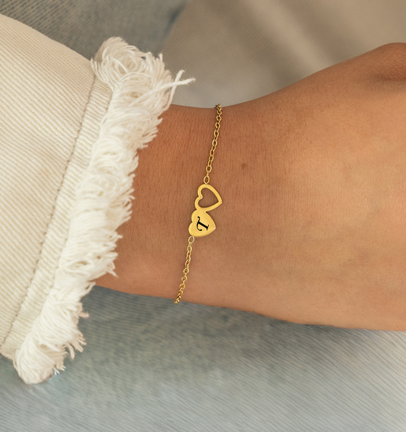 Bracelet Two Hearts with Initial | Stainless Steel - Gold