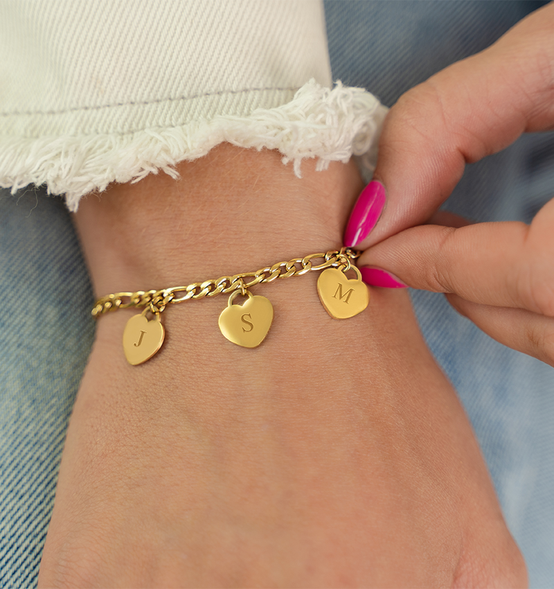 Draag je dierbaren altijd bij je met deze armband met drie hartvormige bedels en initialen.