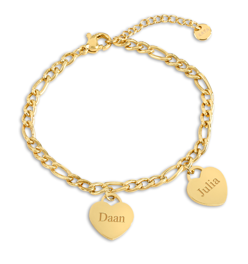 Een persoonlijke touch: armband met twee hartvormige bedels die je kunt laten graveren.