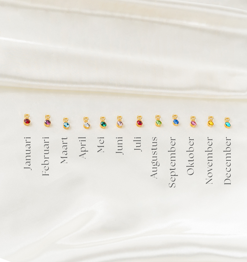 ♡ Voor dit sieraad gebruiken we zirconia kristallen waarvan de kleuren zijn geinspireerd op de oorsprokelijke edelstenen. Zo is Januari donkerrood, de kleur van Granaat.
