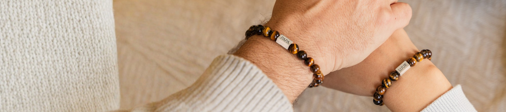 Of jullie nou meer van kralen houden, of toch meer fan zijn van de leren armband. Zwart of bruin, groot of klein. Als je op zoek bent naar een vader zoon sieraad dan ben je bij ons aan het juiste adres. We graveren naar wens zodat je een mooi gepersonaliseerd sieraad kunt geven of krijgen aan vader en zoon. Zijn ze niet zo van de sieraden? Kijk dan eens bij onze collectie gepersonaliseerde sleutelhangers waar je zelfs een tekening of handgeschreven tekst kunt laten graveren! Shop direct een moeder dochter armband en het gezin is compleet!