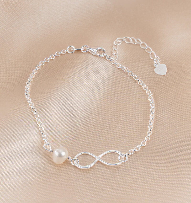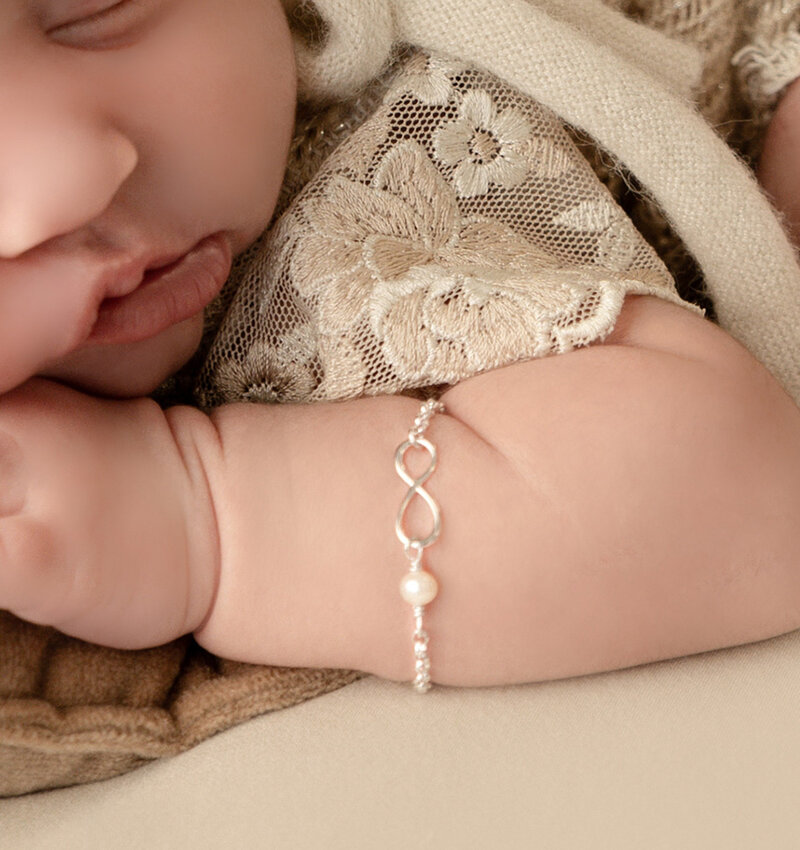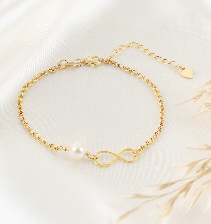 Minimalistisch babyarmbandje met een infinity teken en sprankelende zoetwaterparel.