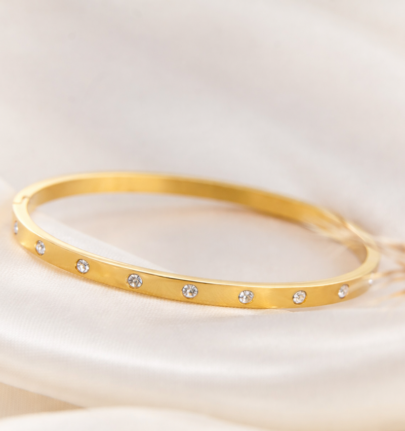 Een unieke versie van de klassieke bangle. De kleine Zirkonia steentjes maken het geheel helemaal af. Deze luxe armband draag je bij iedere outfit.