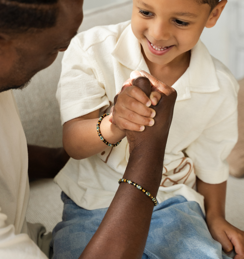 Groene edelsteenkralen en gouden details van roestvrij staal maken deze kinderarmband klaar voor elk avontuur.