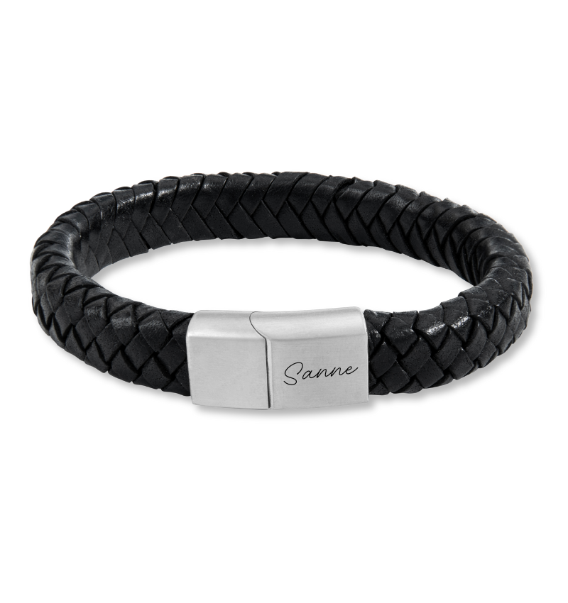 Leren herenarmband met een robuuste uitstraling en een persoonlijk verhaal. Laat de sluiting graveren met het handschrift van je dierbaren en draag hun woorden altijd dicht bij je.