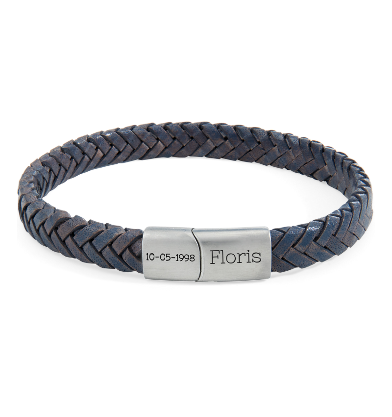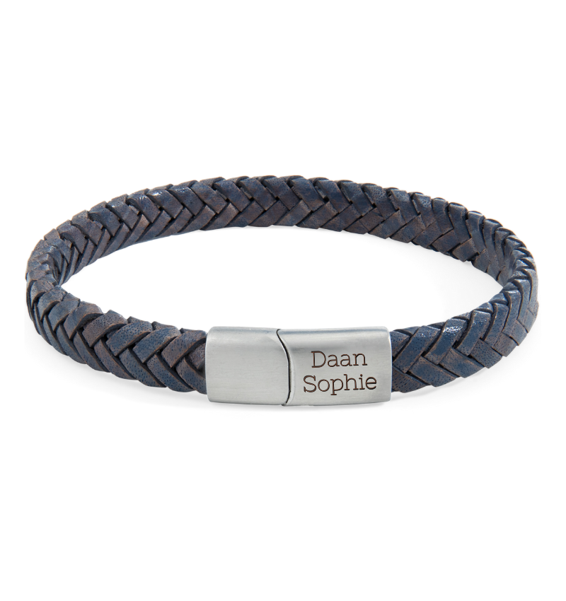 Gevlochten Armband Leer Heren met Gravure - Blauw