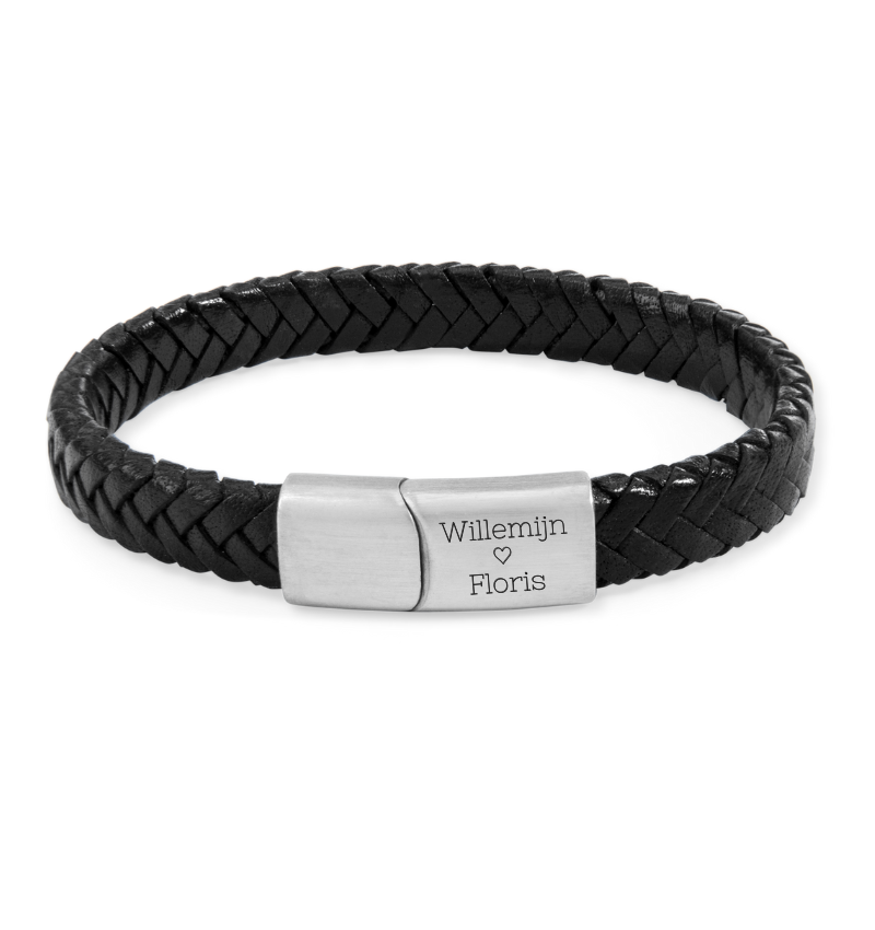 Robuuste heren armband zorgvuldig gevlochten van écht leer. Laat op de sluiting een naam of initialen graveren voor een betekenisvol cadeau!