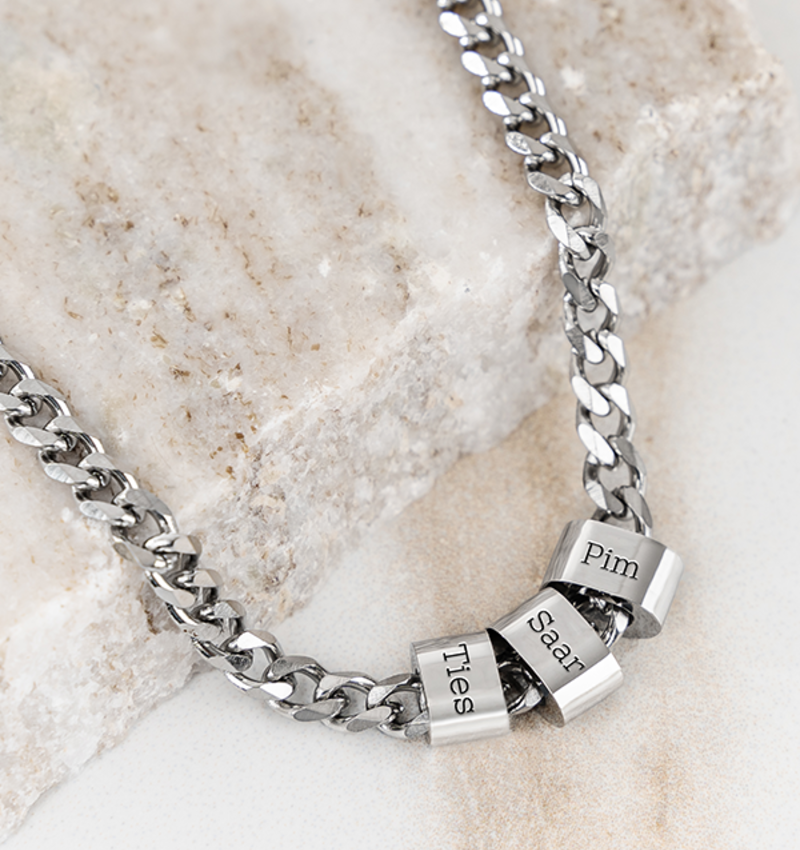 Deze stoere schakelketting voor heren, met drie naambedels, maakt je stijl persoonlijk en betekenisvol