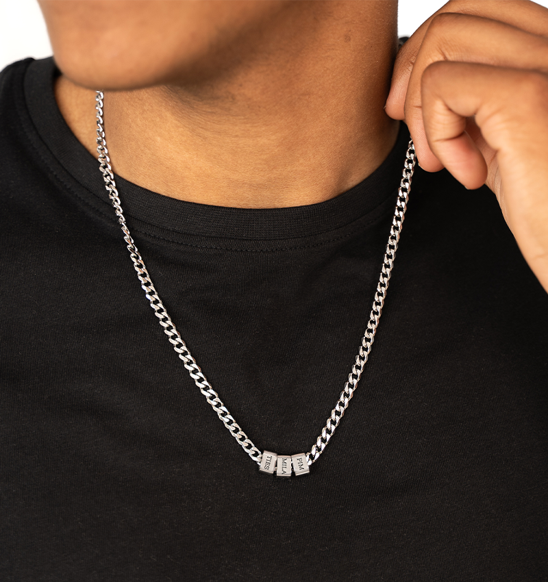 Deze stoere schakelketting voor heren, met drie naambedels, maakt je stijl persoonlijk en betekenisvol