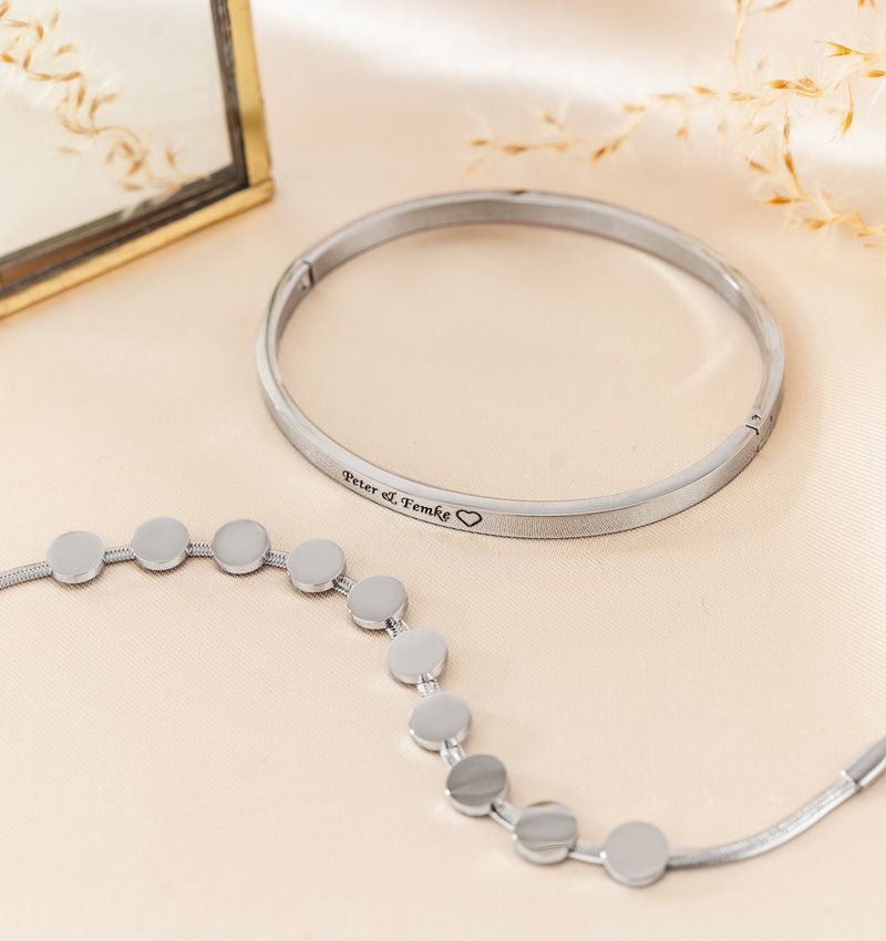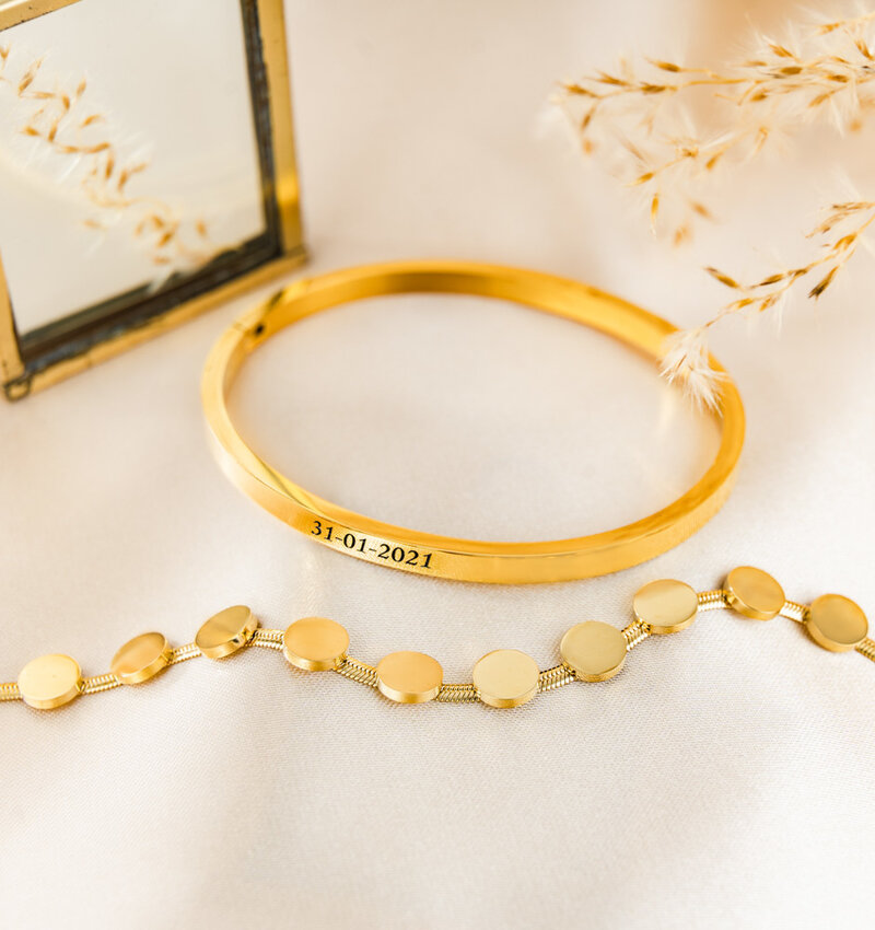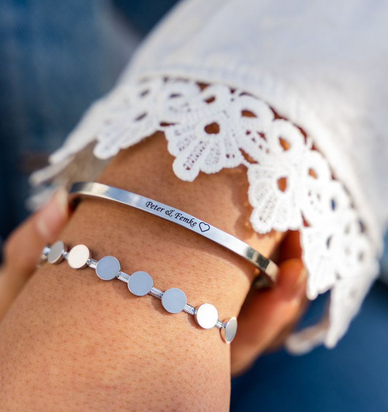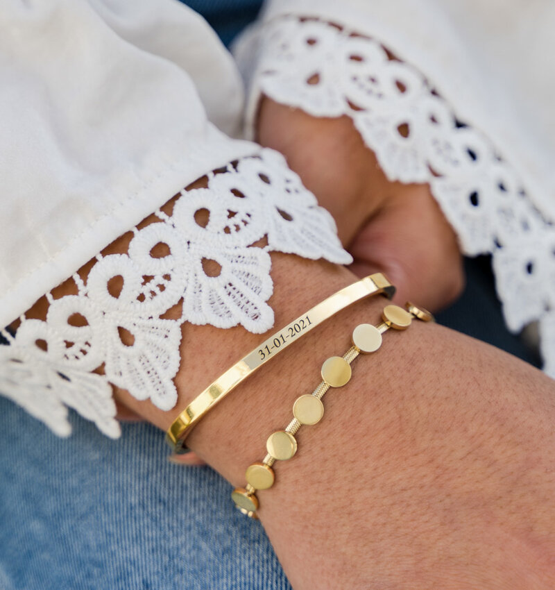 Deze speelse armbanden set, met slavenarmband en armband met munten, geeft je outfit een bold look. Maak jouw bracelet party nog persoonlijker door een gravure op de slavenarmband te plaatsen.