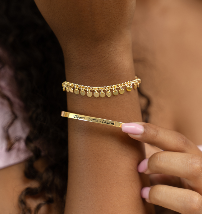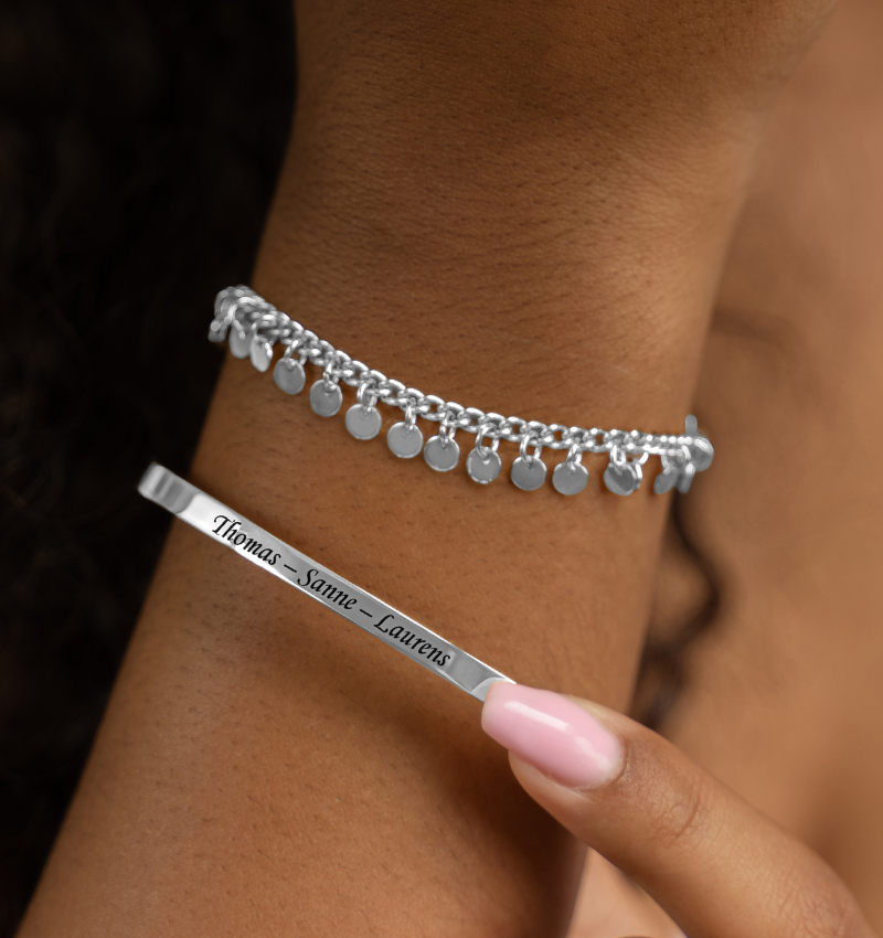 Deze stijlvolle set met een slavenarmband en een armband met kleine muntjes heeft een tijdloze Ibiza Boho uitstraling. Maak jouw bracelet party extra persoonlijk door een gravure op de slavenarmband toe te voegen.