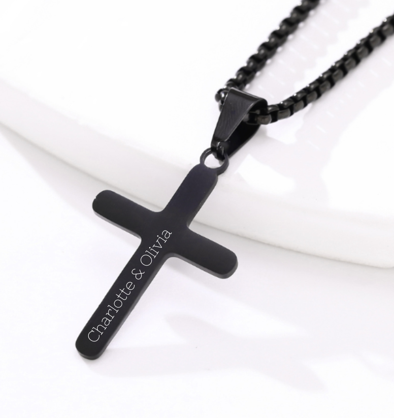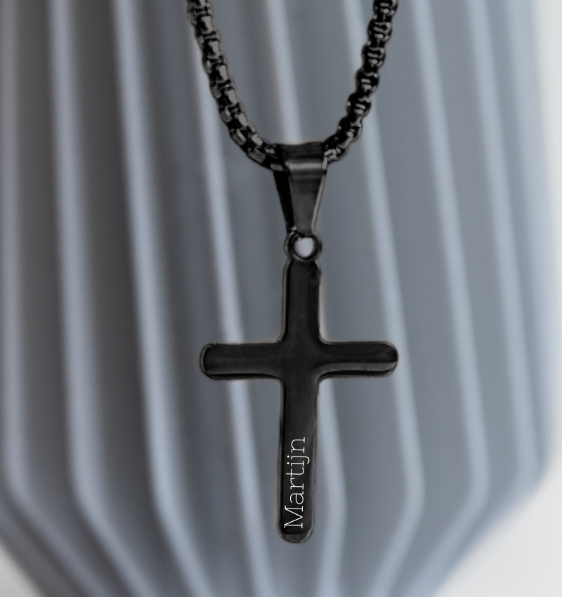 Stalen herenketting Kruis met Gravure | Zwart - RVS