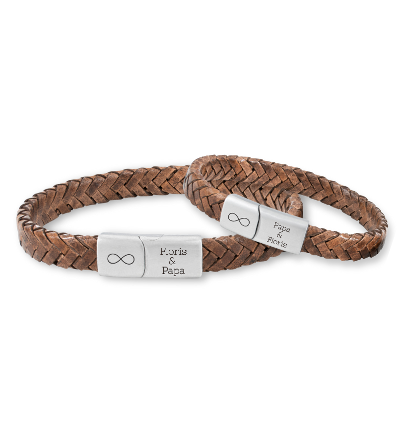 Twee armbanden, één band. Een robuuste set van zorgvuldig gevlochten leer, met gravures als krachtig symbool van jullie band.